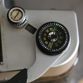 Première photo: 1- Sélecteur de pellicule 120 ou 220. 2- Vis de réglage du bras qui gère l'espacement des vues. 3- Déblocage du réglage du bras qui gère l'espacement des vues. 4-Roulette du bras qui gère l'espacement des vues. 5- Arrêt empêchant le compteur de vue de revenir en arrière quand le dos est fermé. 6- Levier repoussant le bras (5) quand le dos est fermé. 7-Engrenage à ressort pour ramener le compteur à zéro quand le dos est ouvert. 8- Levier qui se relève quand la pellicule est finie. 9- Téton du levier (8) engrené dans la gorge sous la pièce de la photo précédente. 10- Levier oscillant, entrainé par un engrenage situé sous la mécanique et qui permet l'avancement du disque à chaque vue. Deuxième photo: Photo identique avec en plus l'anneau en laiton qui bloque la pièce centrale mobile.