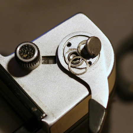 Première photo: Téton de la pellicule débitrice, situé sur la face supérieure du logement gauche. Il faut le dévisser pour sortir le bloc. Deuxième photo: Téton de la pellicule réceptrice. Son démontage n'est pas nécessaire.